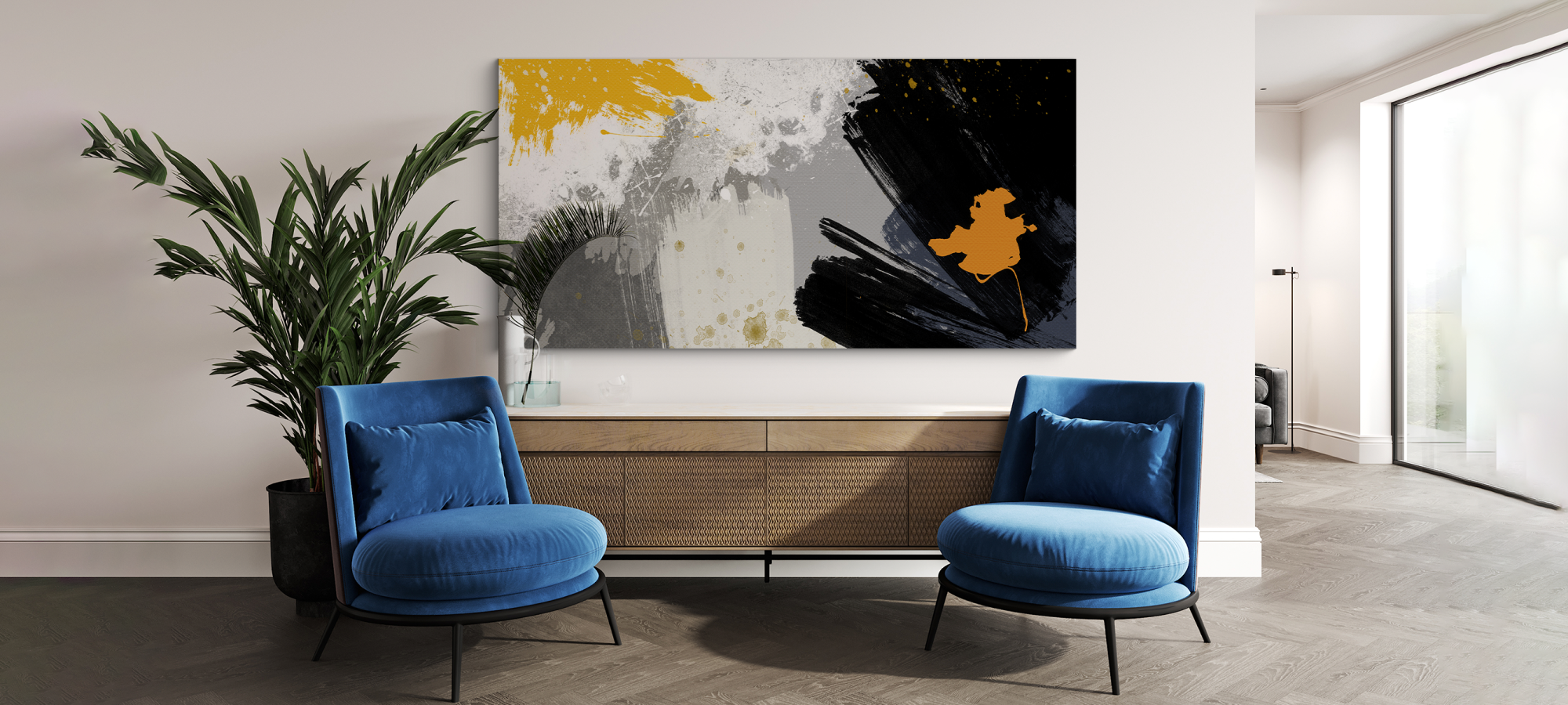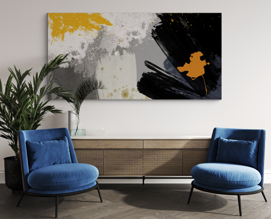 Two serene birds perch on a vibrant yellow stripe, contrasting the muted tones of a textured background. This minimalist piece, evoking tranquility and simplicity, suits a modern living room or study.